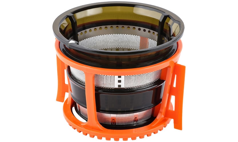 Un bol central est installé sur l'unité motrice, mobile par rapport à l'unité. Un tamis en acier inoxydable est placé à l'intérieur du bol central. Il y a une vis mobile à l'intérieur du tamis. Le design est complété par un col avec un trou pour l'insertion du produit. L'entonnoir de remplissage est large, il est possible de déposer des aliments non coupés.