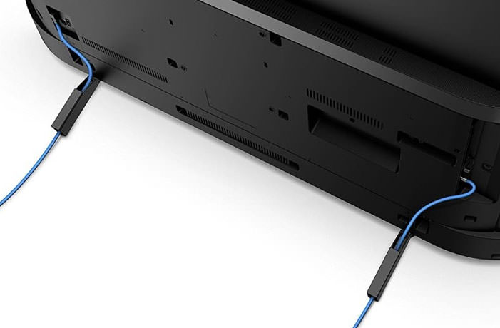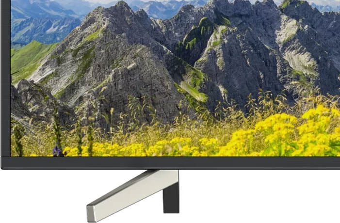 Le boîtier noir Sony avec une lunette en aluminium est magnifique. Le support VESA 200 × 200 mm est fourni pour le montage mural. Il y a deux pieds pour l'installation sur la table, grâce à quoi les dimensions augmentent à 1242 × 784 × 356 mm. Les pieds ont des compartiments pour l'acheminement des câbles pour un look plus propre. Les pattes sont assez fortes et stables. Leur poids est de 1,2 kg. À titre de comparaison: les jambes de Samsung ne pèsent que 500 g, ce qui les rend peu fiables. LG a un support - une jambe avec une large base semi-circulaire. Il a une apparence plus attrayante et est stable.