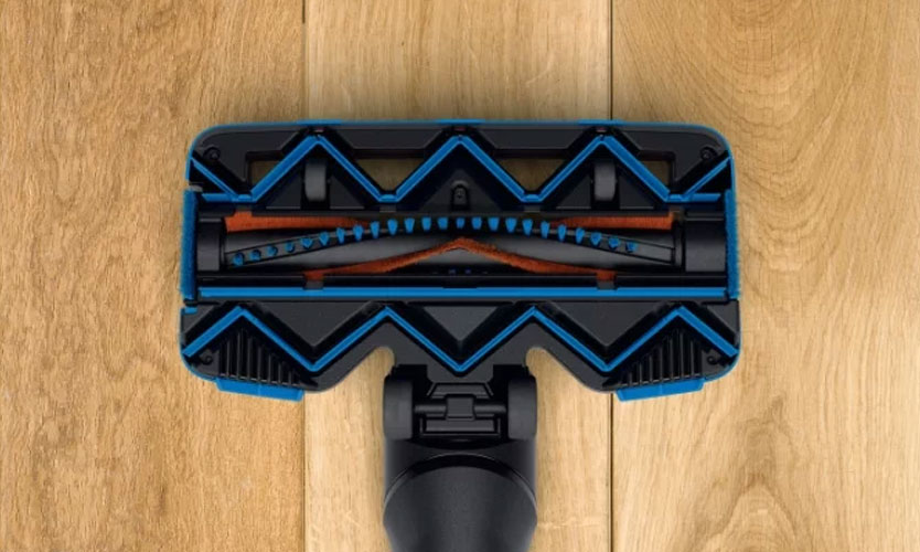 Brosse rotative avec touffes spirales à quatre rangées de poils de différentes couleurs et rigidité. Dur - bleu - rassemblé en un bouquet, doux - orange - dans une rangée uniforme. Le couvercle transparent donne un contrôle visuel de la rotation. La brosse a un système de séparation sophistiqué fait de courroies flexibles qui fournit 3600 collecte des déchets comme indiqué par le fabricant. La glisse est assurée par une paire de roues avec des pneus en plastique souple et une paire de roues de plus petit diamètre plus près du bord supérieur. La protection contre les dommages aux meubles et aux surfaces a été réalisée avec une bande de caoutchouc dur devant et derrière le corps. Le tube contient des conducteurs pour transmettre l'électricité au moteur électrique et au rétroéclairage.Si nécessaire, vous pouvez fixer la pièce directement sur l'unité principale