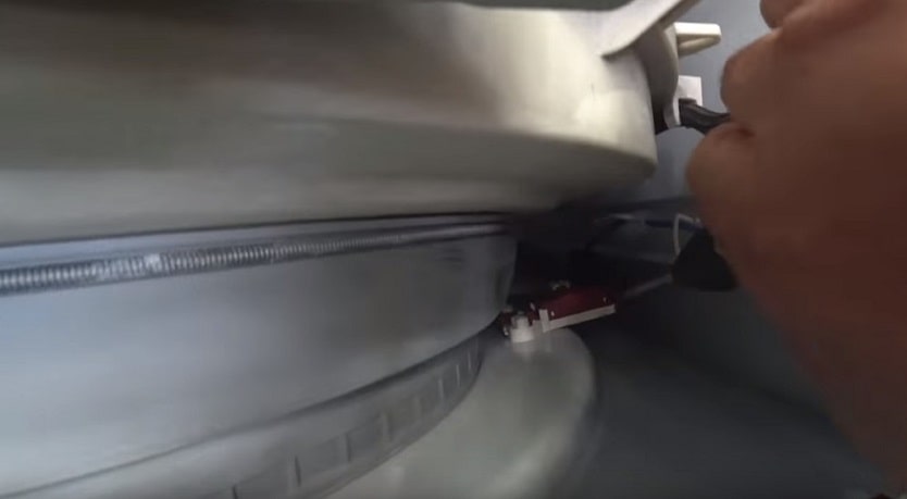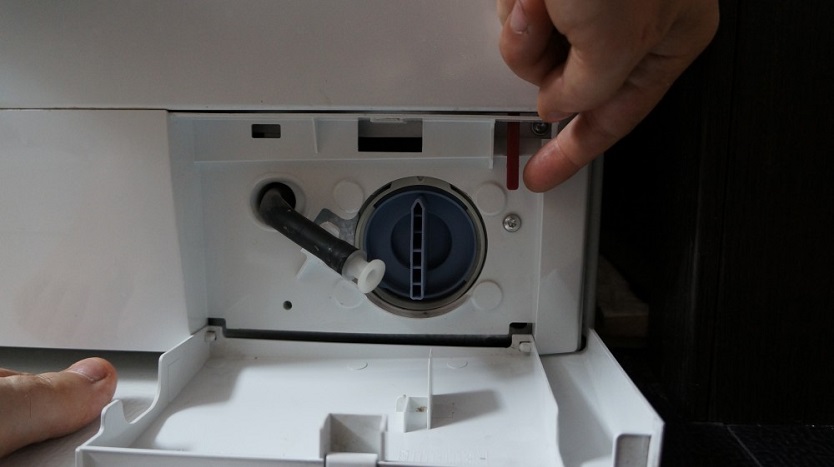 - Si la machine est équipée d'une ouverture d'urgence, il est nécessaire de tirer sur un câble ou un levier spécial. Il est situé près du filtre de vidange. Pour y accéder, vous devez retirer le panneau inférieur.